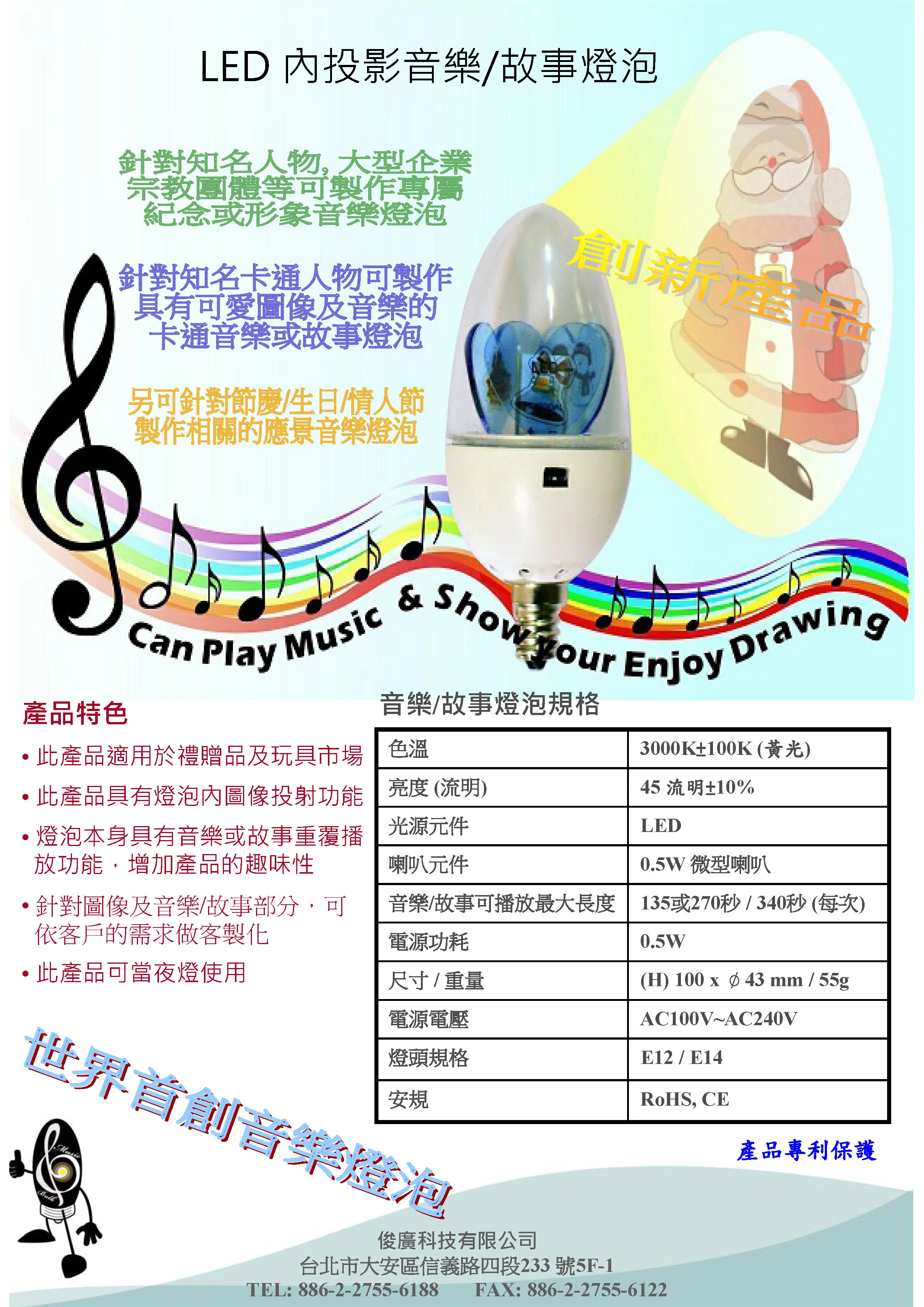 ~本公司造型內投射燈泡產品,具有如下功能:1、投射圖像、撥放音樂、故事或歌曲的功能2、整體體積輕巧,與傳統的高科技產品的